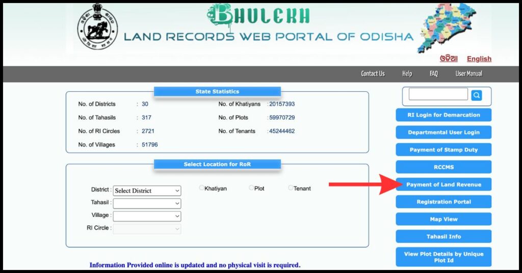 To payment land revenue on the bhulekh odisha portal, follow below steps: