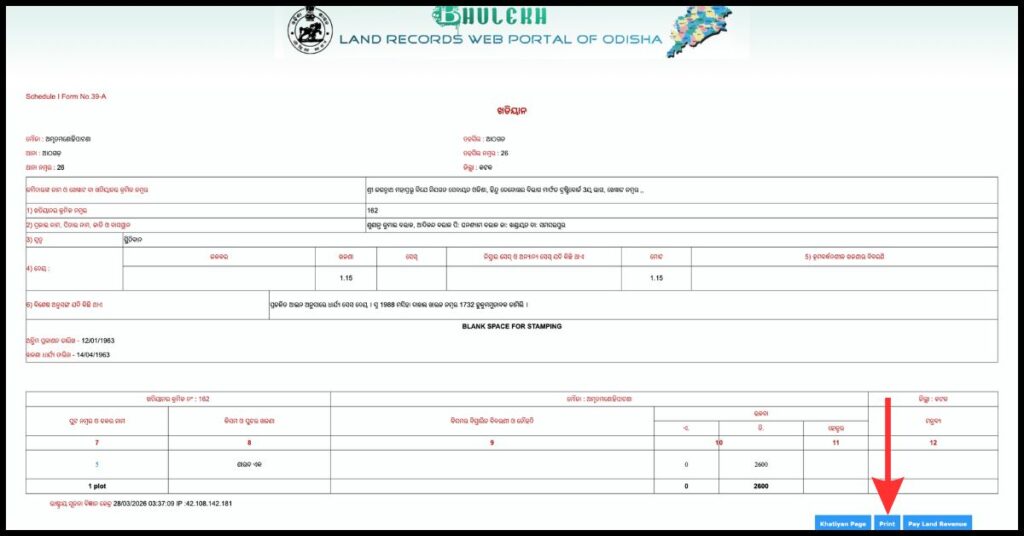 Step 7: View Your Land Map Records: The portal will display all bhulekh related information associated with that khatian number such as the bhulekh odisha plot details map, area, owner’s name, land classification, and mutation status (if applicable).